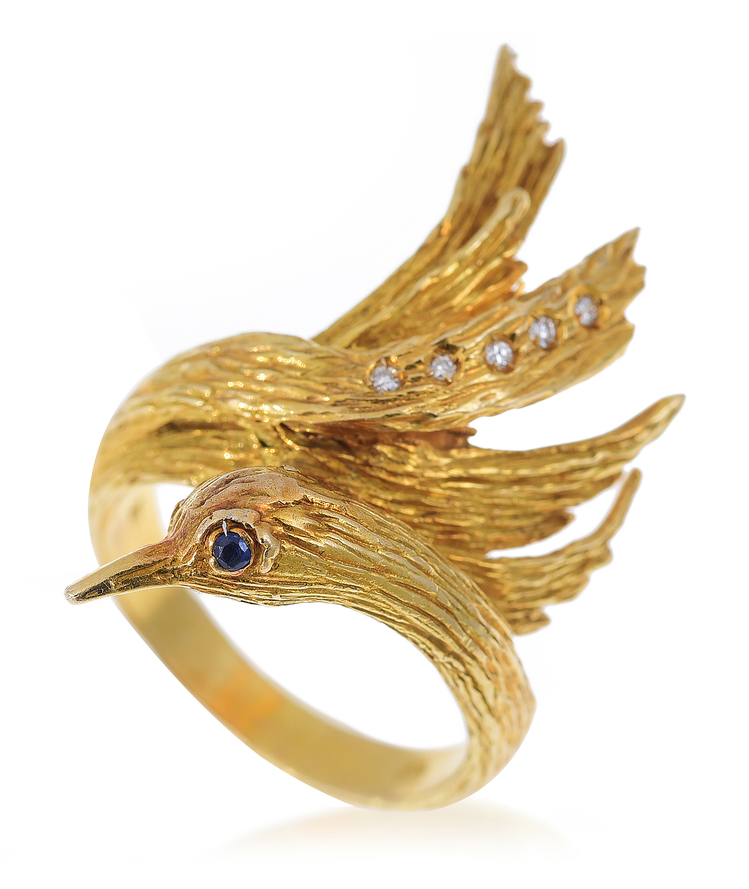 Finely modelled as a bird, the wings set with a row of single cut diamonds and sapphire set eyes, mounted in 18ct gold, ring size J.