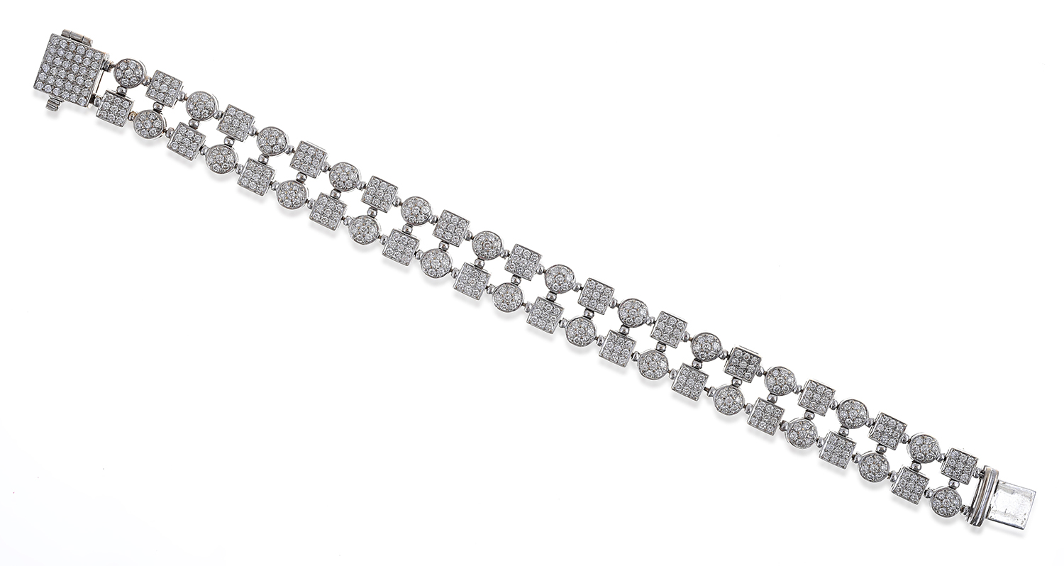 Comprising a double row of forty eight panels of alternating squares and circles, each grain set with round brilliant cut diamonds, finished with a larger diamond set square clasp, total diamond weight 4.44cts, mounted in 18ct white gold, total length 180mm.