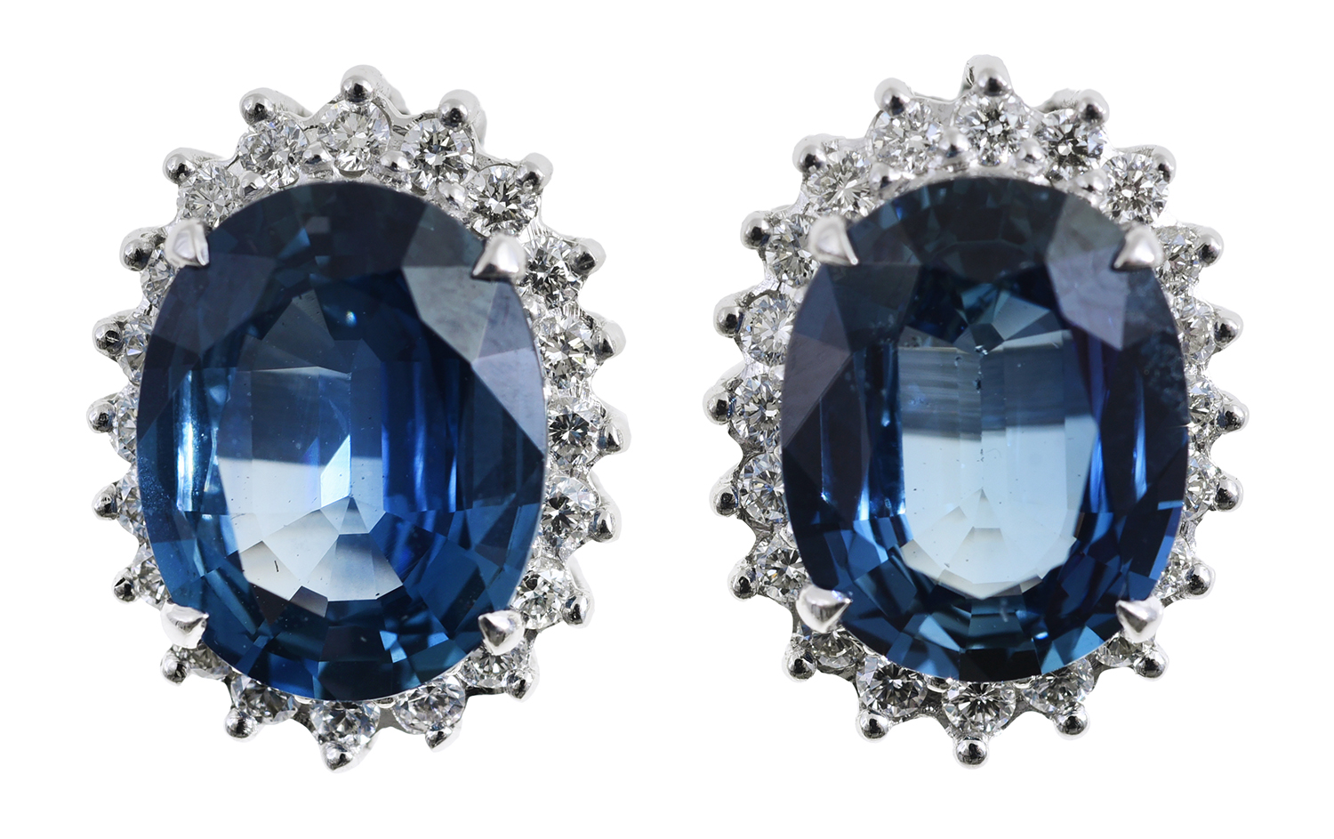 Each set with a oval sapphire weighing 2.50cts, in a border of brilliant cut diamonds, mounted in 18ct white gold.