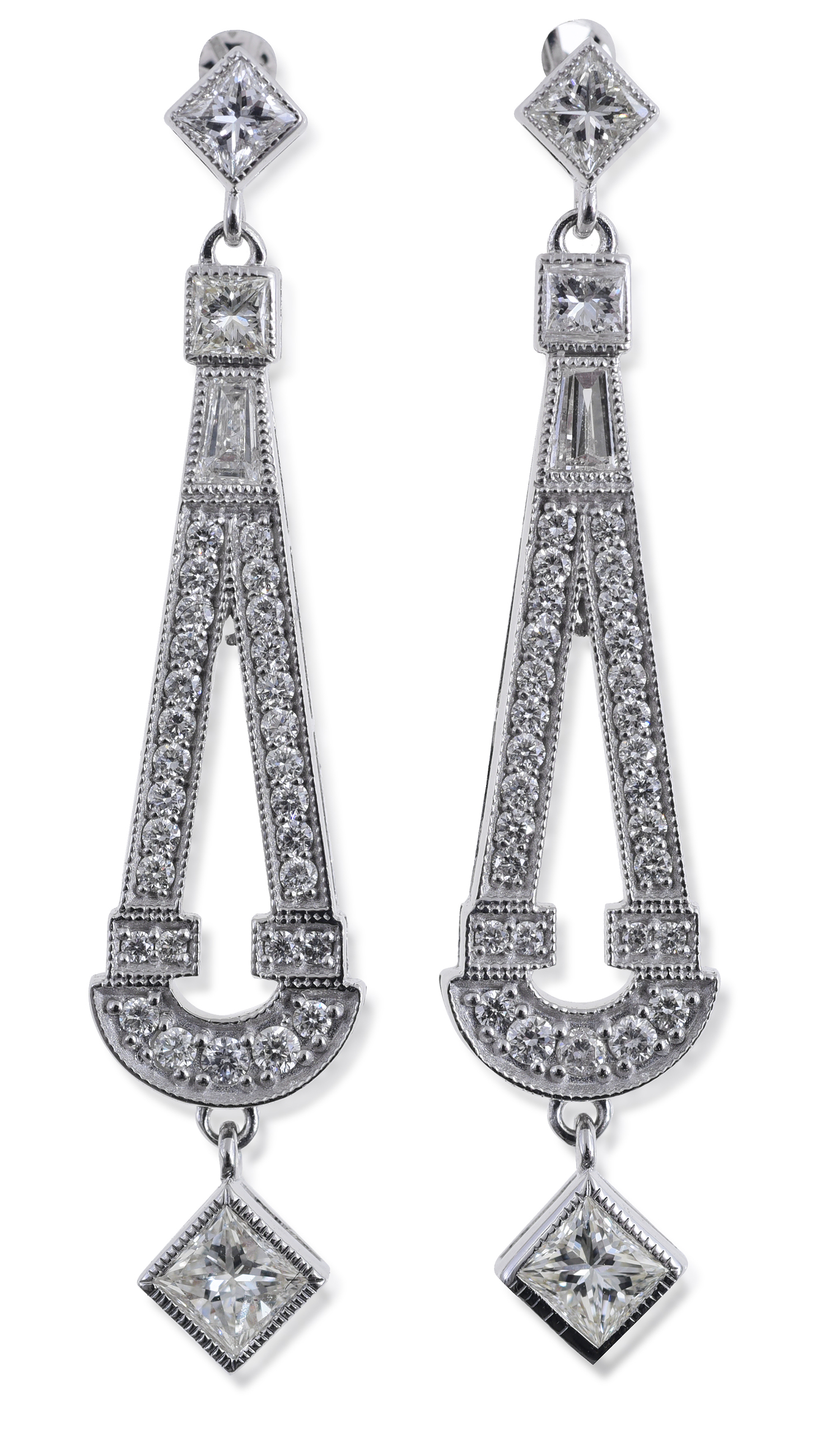 Each featuring a princess cut diamond suspended below a diamond set geometric panel, mounted in 18ct white gold.