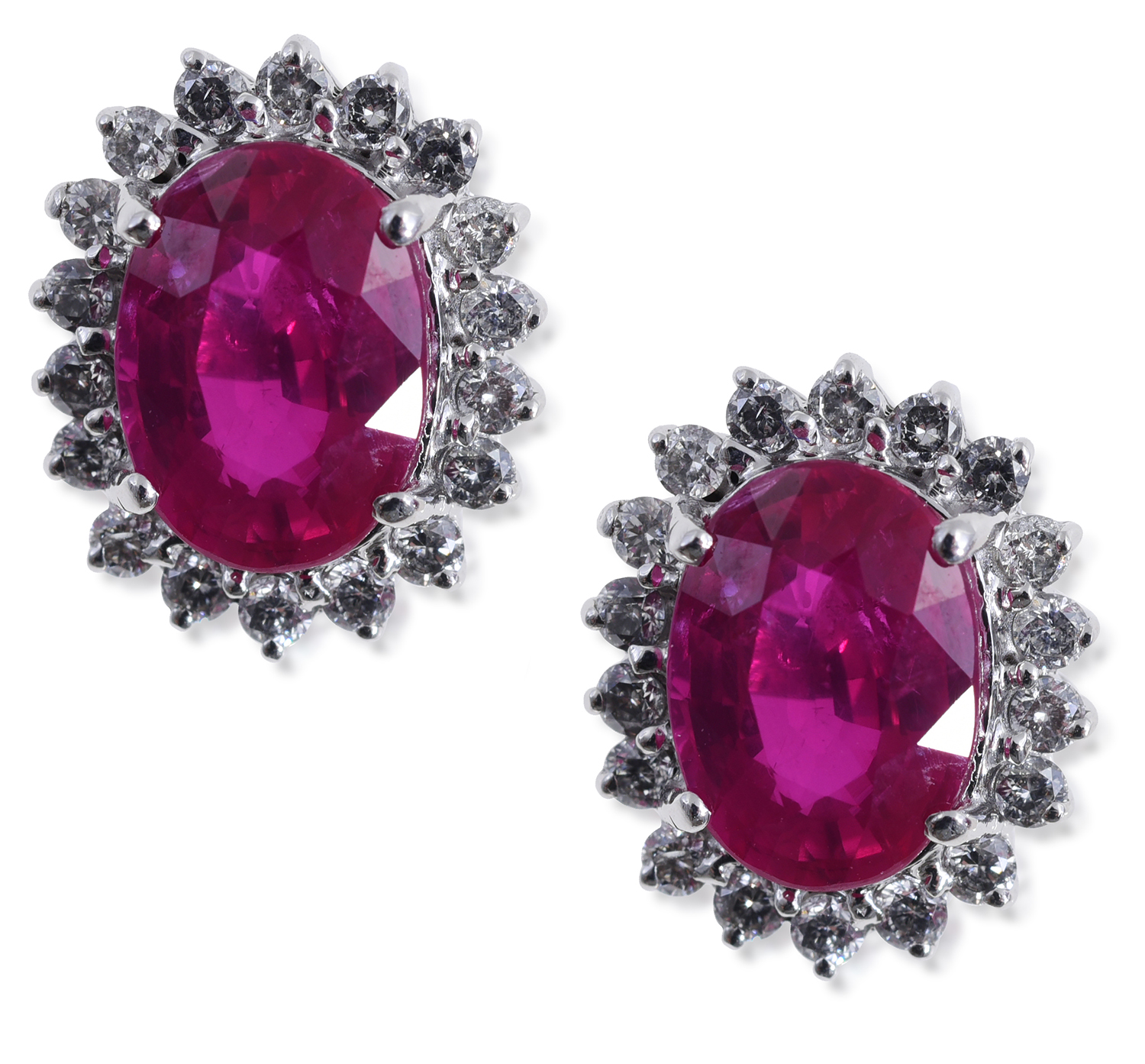 Each set with an oval cut ruby of 1.80cts, having round brilliant cut diamonds set to the surround, mounted in 18ct white gold.