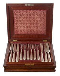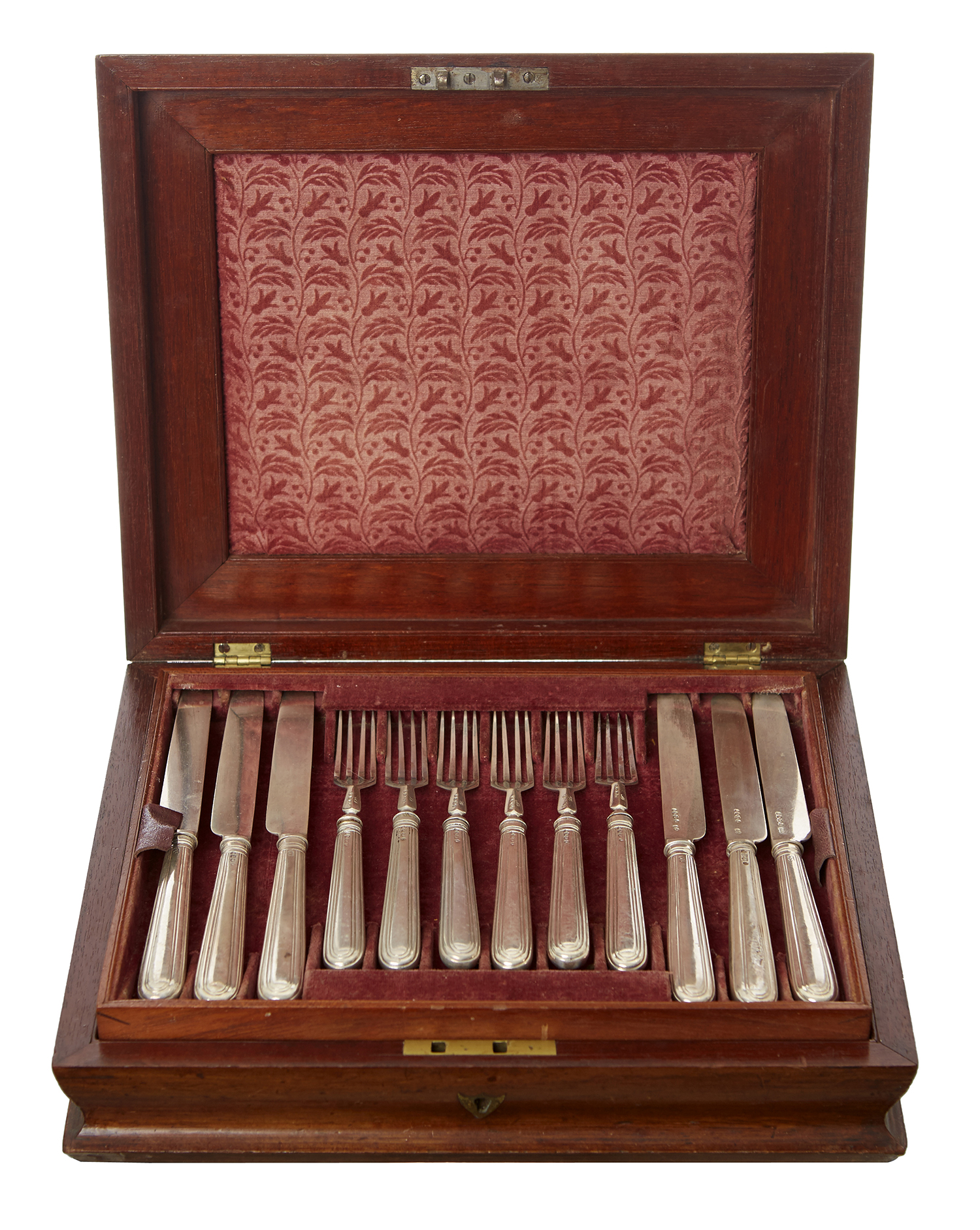 Housed within original rosewood fitted case with brass cartouche, in double thread pattern and sterling blades, total weight 1370 grams