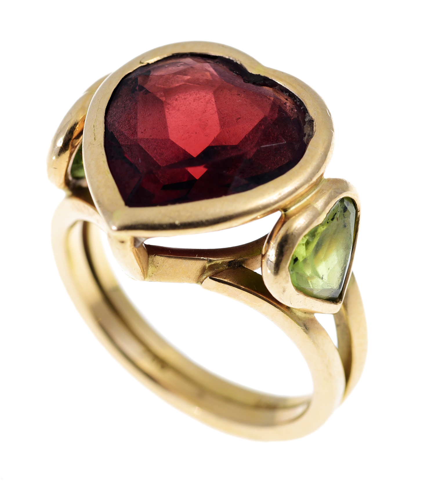 The heart cut garnet of 6.20cts, having heart cut peridots set to each shoulder totalling 2.12cts, mounted in 18ct gold, ring size N-O.