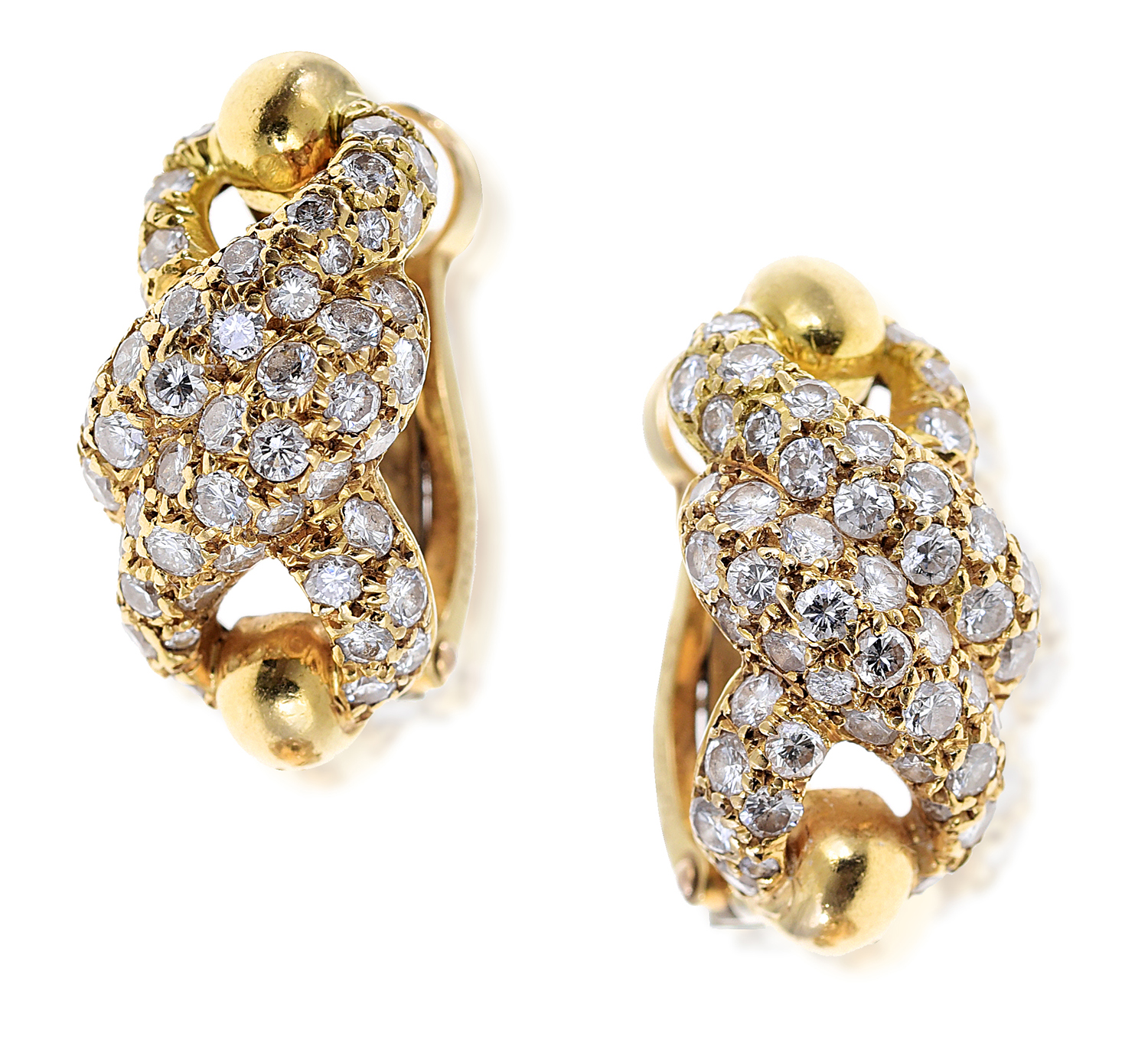 The pierced domed panels of plaited design set with round brilliant cut diamonds, mounted in 18ct gold, signed, reference 603050.