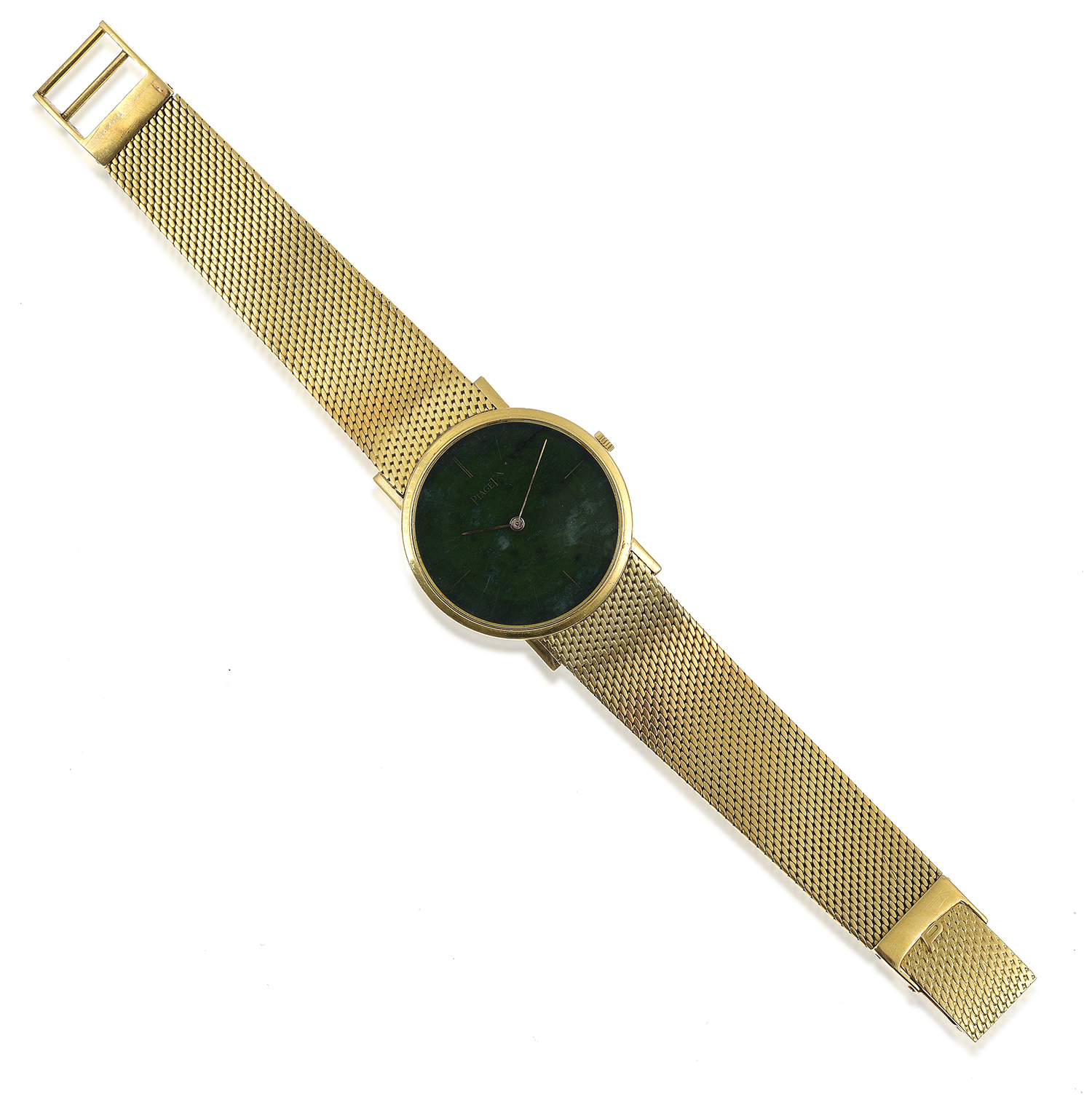 Manual wind movement, circular jade dial with gold baton numerals, signed case, dial and movement, 18ct gold case to integral bracelet bands, 32mm diameter.