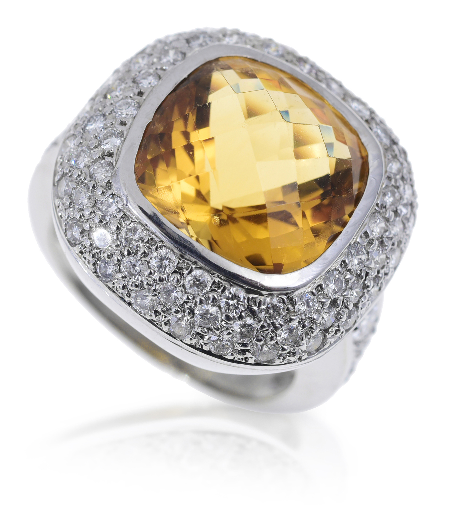Ring presents in excellent condition with all stones appearing well secured. Very small abrasion to one facet of citrine. Diamonds are all of good quality colour G-H, clarity VS-SI.