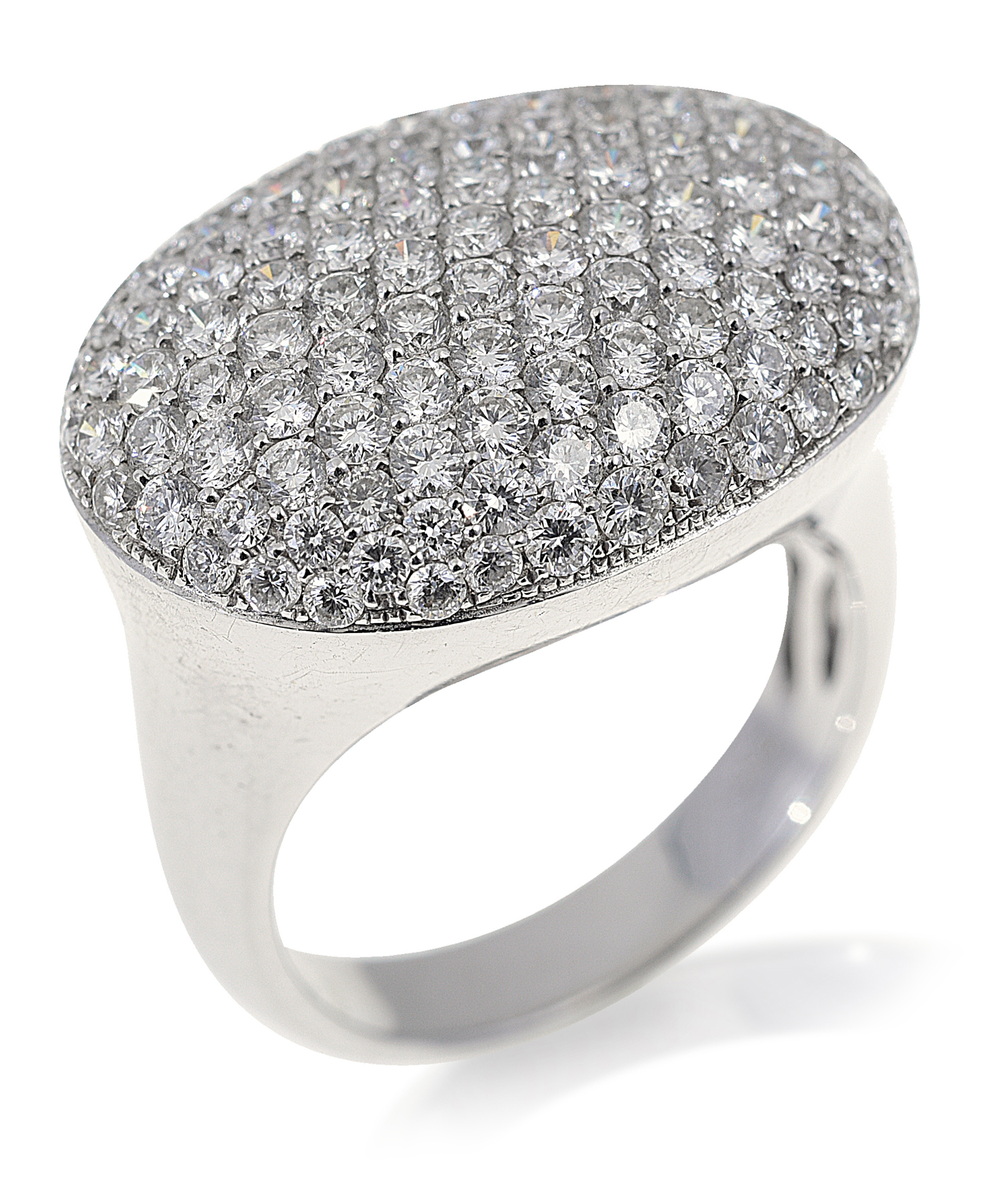 The oval panel pave set with round brilliant cut diamonds totalling 2.70cts, mounted in 18ct white gold, ring size N.