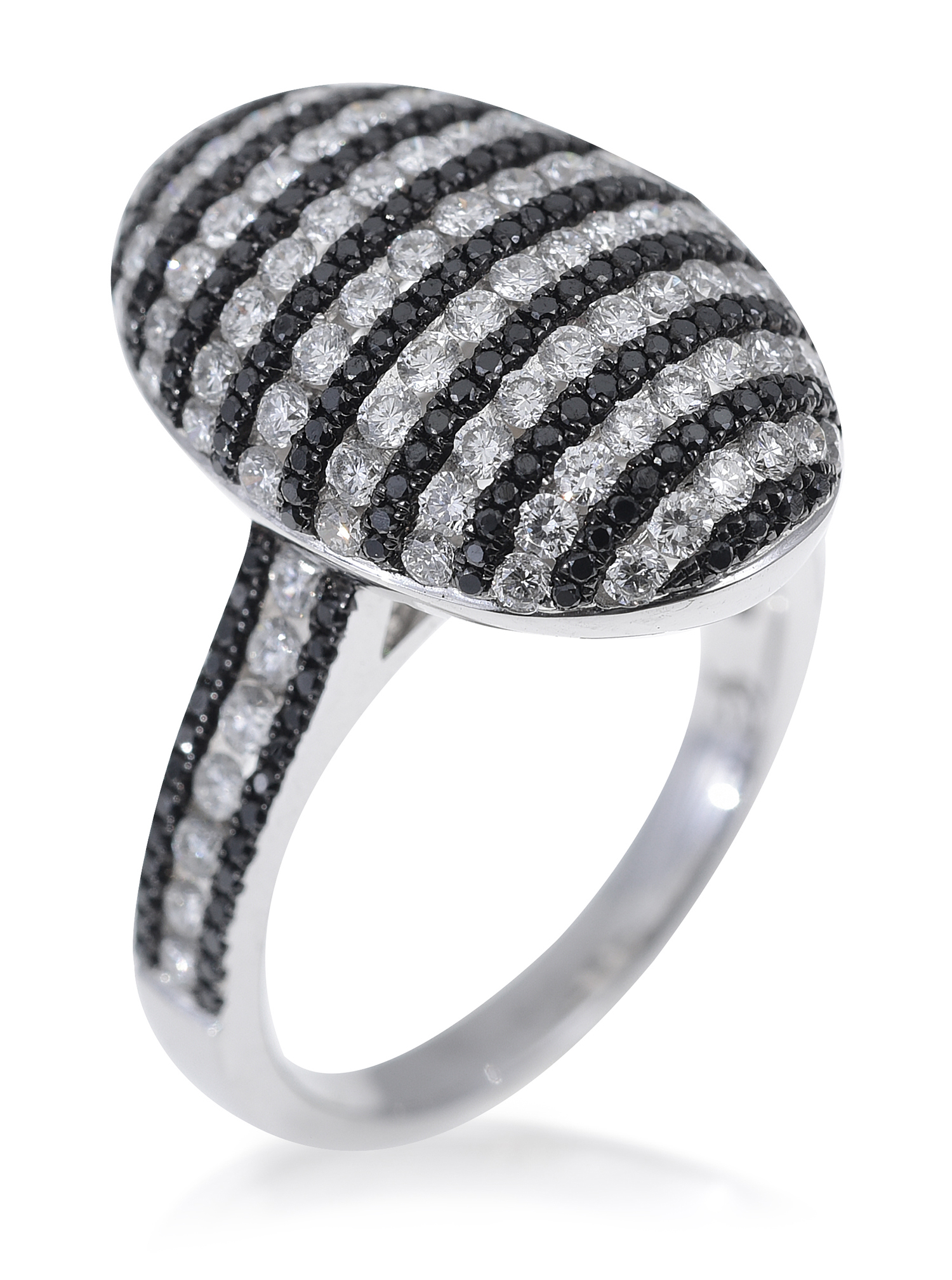 The oval domed plaque featuring alternating rows of pave set round brilliant cut black and white diamonds with conforming detail to the shoulders, total diamond weight 2.50cts, mounted in 18ct white gold, ring size N.