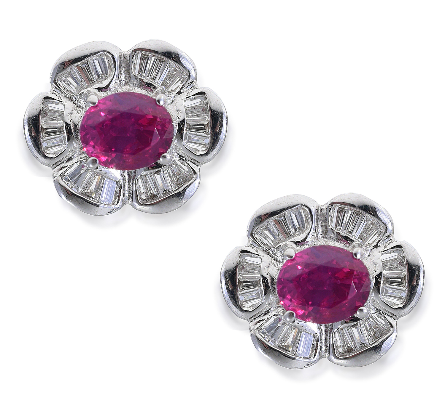 Each modelled as a flower cluster, centrally set with an oval cut ruby and having baguette cut diamonds set to the surround, mounted in 18ct white gold.