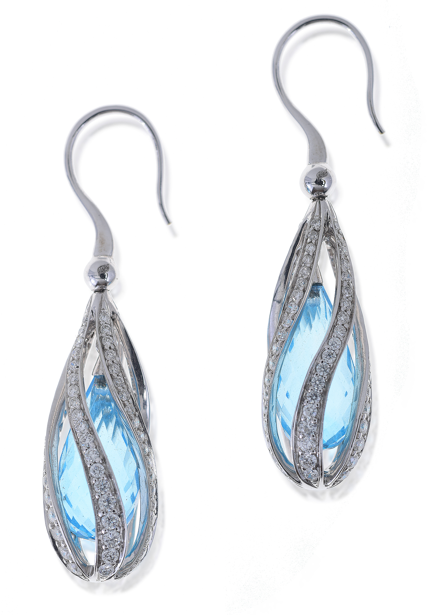 Each earring set with a briolette cut topaz of 6.00cts, encased in a pierced frame set with round brilliant cut diamonds totalling 0.71cts, mounted in 18ct white gold.
