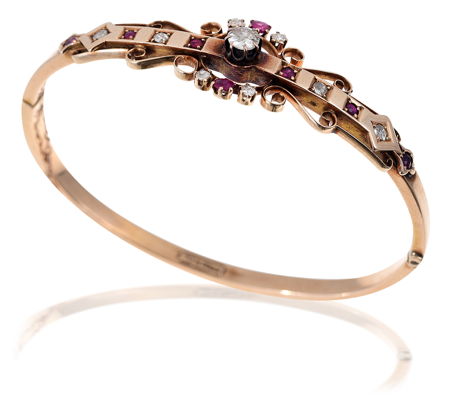The oval hinged bangle of scroll and pierced design centrally set with an old European cut diamond of 0.35cts, having ruby and diamond detail set throughout, mounted in 15ct gold, signed Denis.