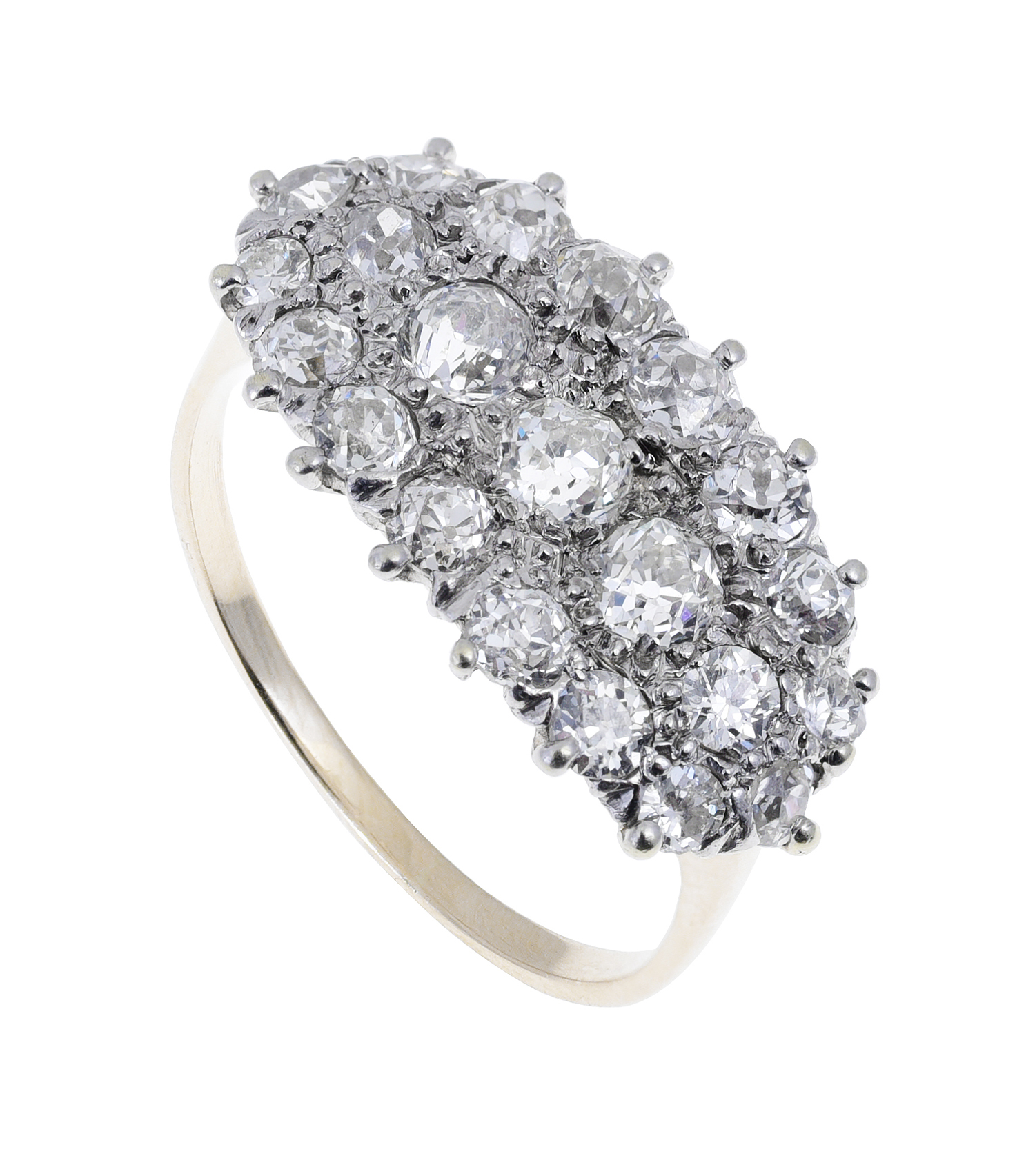 The oval plaque set with three rows of old European cut diamonds, mounted in 18ct white and yellow gold, ring size R-S.