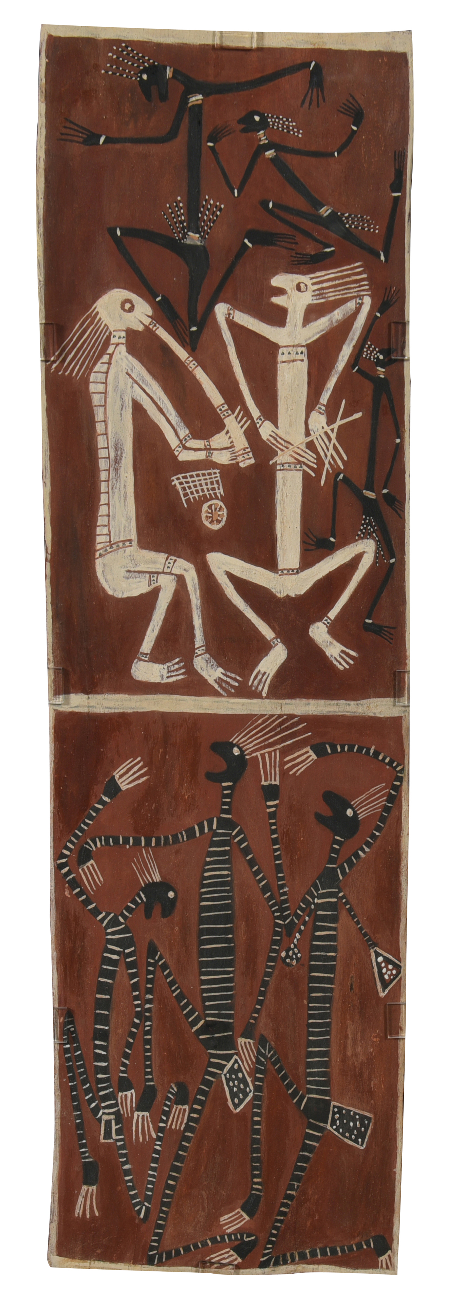 This painting was originally sold with documentation that read, 'Mimi spirits of increase caves performing a ritual to call up cumulus cloud spirits in late November. The little black rain and cloud spirits are in a furious motion, dancing, singing and leaping from the dark storm caves, to travel up into the sky on dark rolling clouds to make 'big' rains to refresh the land and renew all life forms. These spirits assist Barra, the 'boss' of the storms to bring in the wet season. In the centre are magic symbols which belong to the Dua and Jirritja moieties. The bottom panel shows ground Mimis dancing and singing for big rains in the coming 'wet' season. They are performing a yam dance: and carry small sweet yams in their dilly bags.'