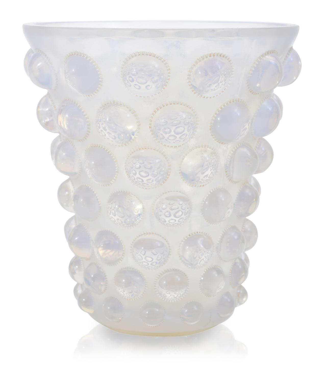 Of flared cylindrical form with rows of roundels on a frosted glass ground, incised to the base Lalique France.