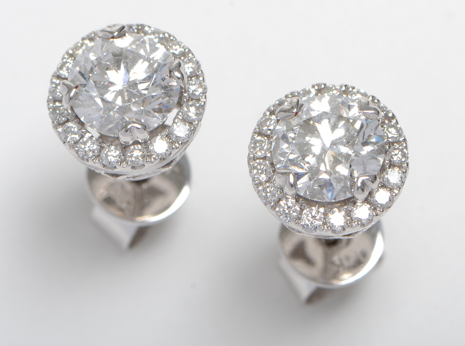 A PAIR OF DIAMOND CLUSTER EARRINGS, EACH SET WITH A ROUND BRILLIANT CUT DIAMOND OF 1.17CTS AND 1.12CTS SET IN 18CT WHITE GOLD, ACCOMPANIED BY EGL CERTIFICATES AND INDEPENDENT VALUATION.