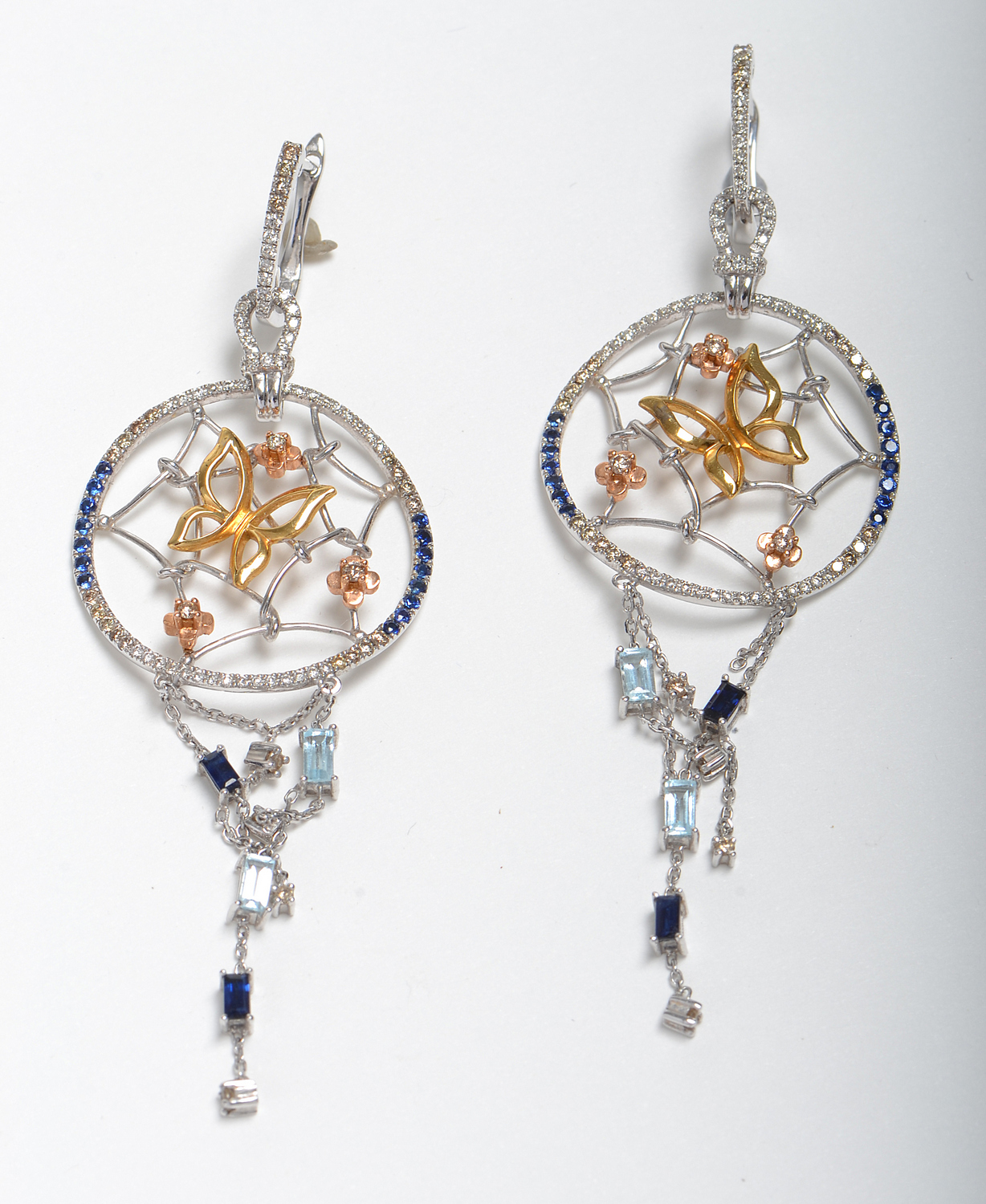 A PAIR OF DIAMOND, SAPPHIRE AND TOPAZ BUTTERFLY EARRINGS SET IN 18CT GOLD, WITH INDEPENDENT VALUATION