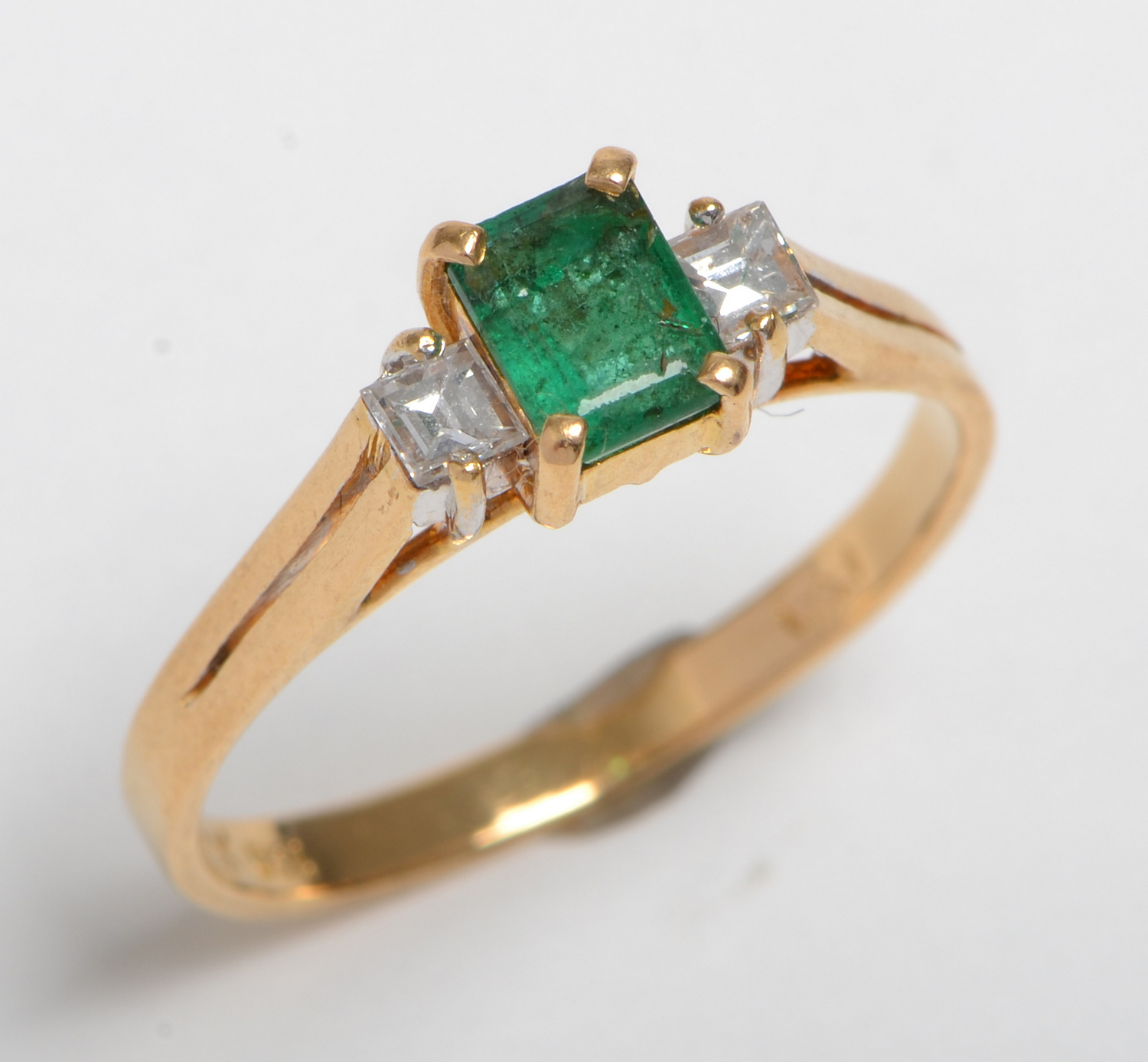 A THREE STONE EMERALD AND DIAMOND RING SET IN 18CT GOLD.
