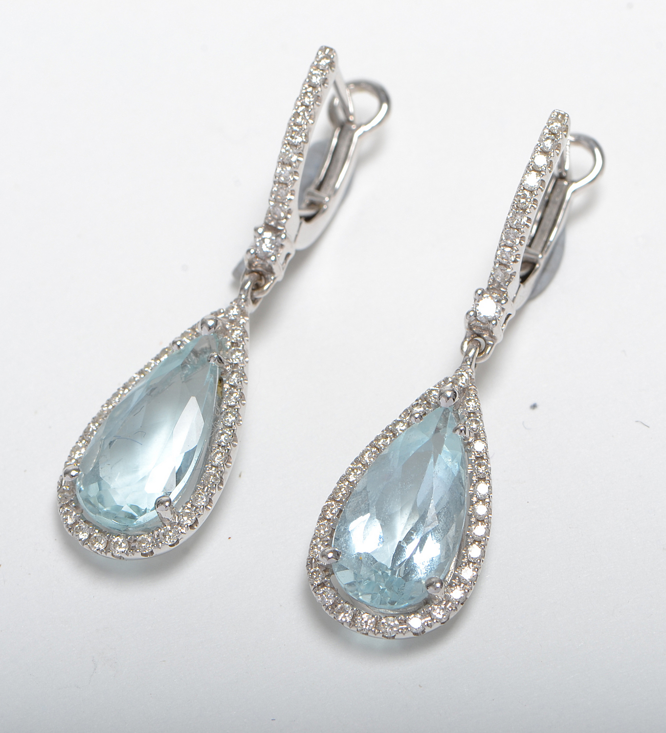 A PAIR OF AQUAMARINE AND DIAMOND DROP EARRINGS SET IN 18CT WHITE GOLD, AQUAMARINES TOTAL 4.43CTS AND DIAMONDS 0.42CTS, WITH INDEPENDENT VALUATION.