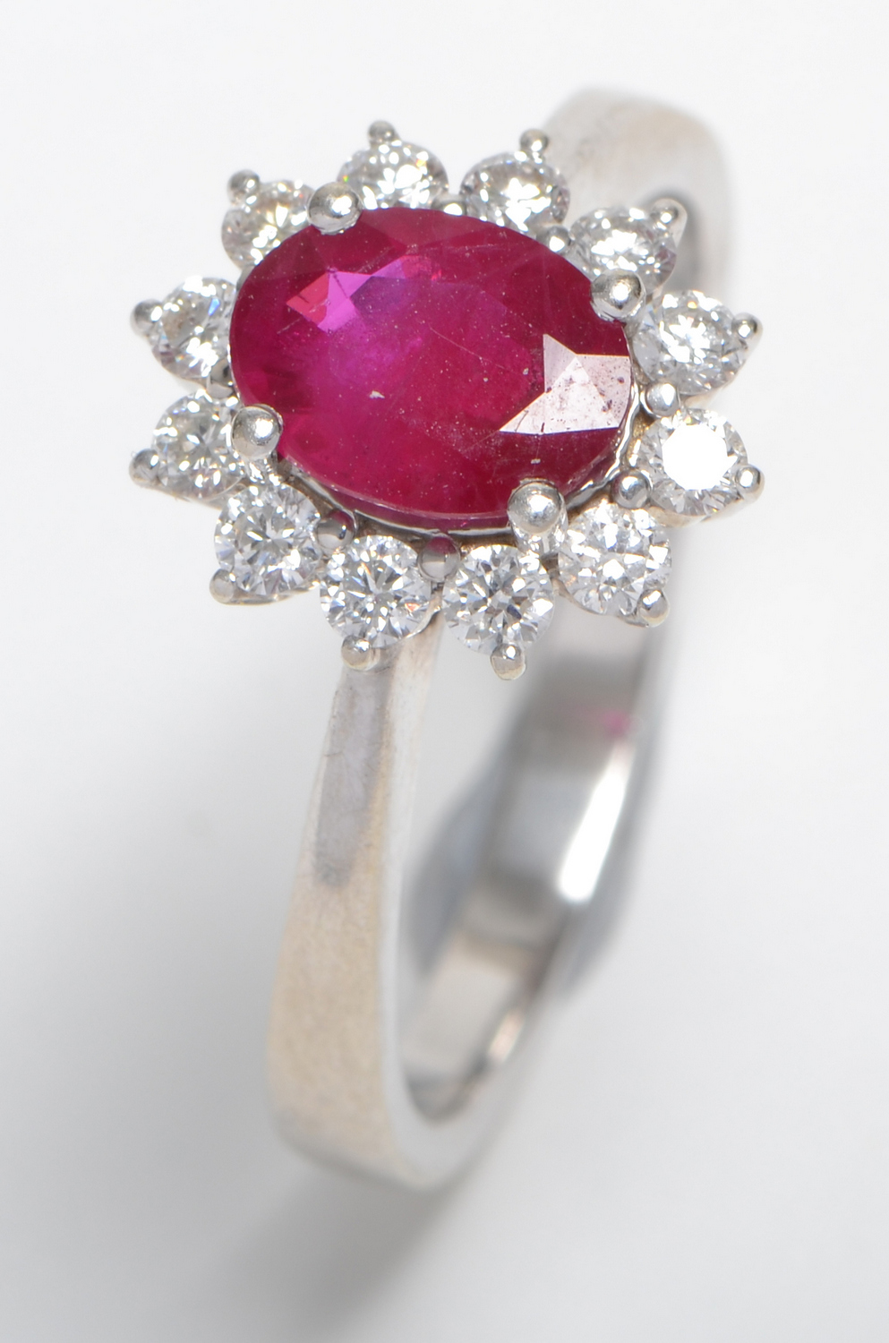 A RUBY AND DIAMOND CLUSTER RING SET IN 18CT WHITE GOLD, RUBY WEIGHING 1.45CTS AND DIAMONDS 0.48CTS WITH INDEPENDENT VALUATION