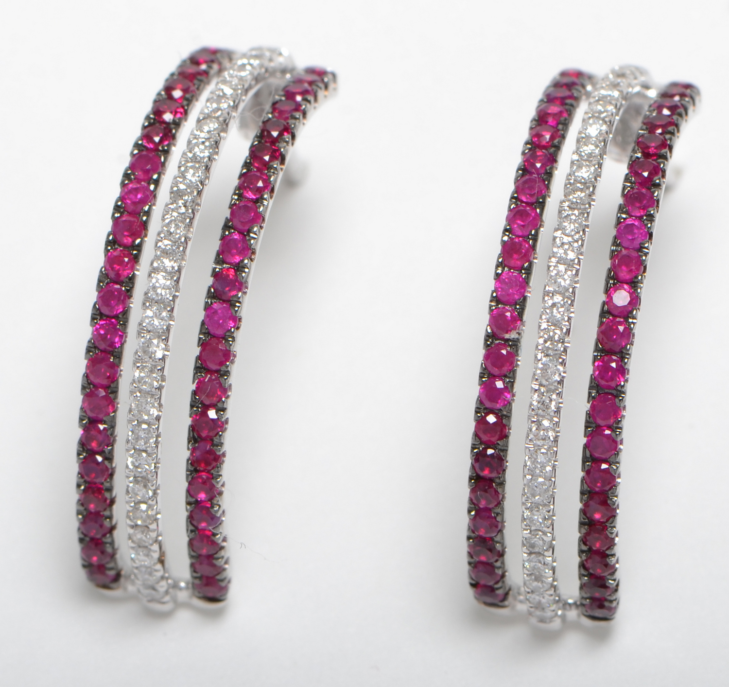 A PAIR OF RUBY AND DIAMOND EARRINGS SET IN 18CT WHITE GOLD, TOTAL RUBY WEIGHT 1.02CTS, TOTAL DIAMOND WEIGHT 0.23CTS, WITH INDEPENDENT VALUATION.