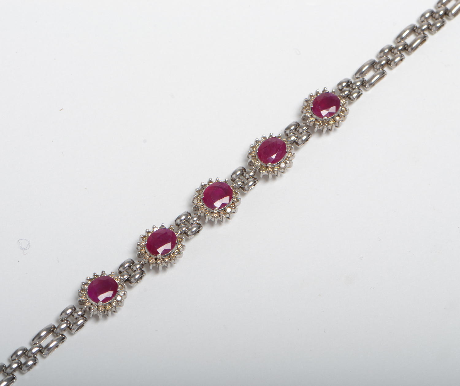 A RUBY AND DIAMOND CLUSTER BRACELET SET IN 9CT WHITE GOLD.