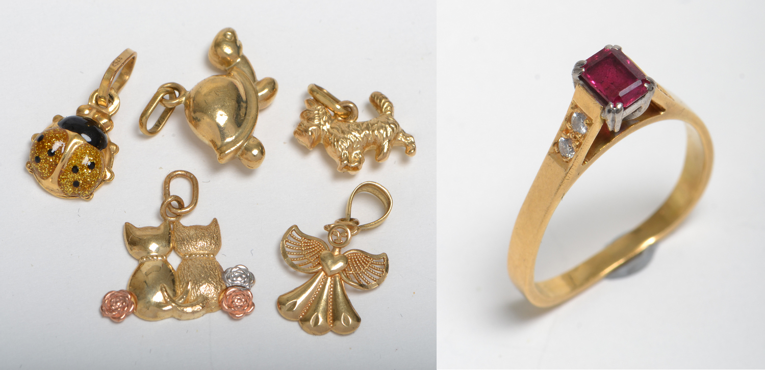 A RUBY AND DIAMOND DRESS RING SET IN 9CT YELLOW GOLD, WITH FIVE 9CT GOLD CHARMS