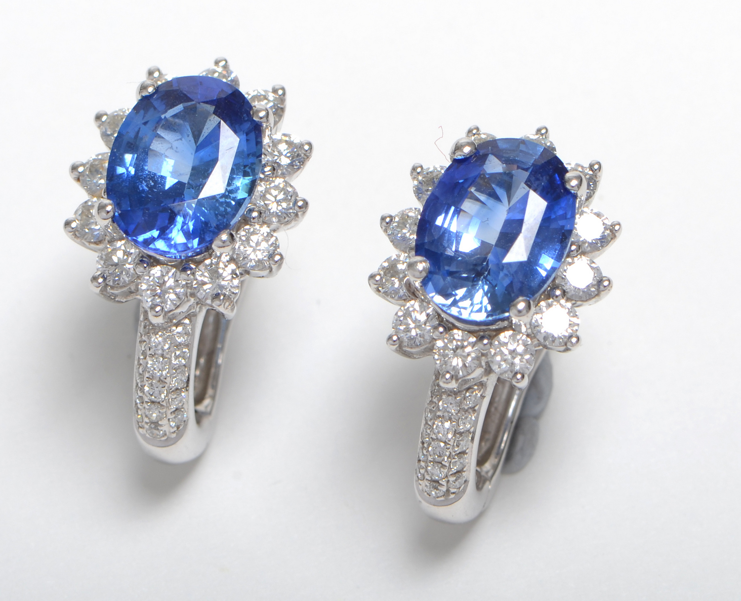 A PAIR OF SAPPHIRE AND DIAMOND CLUSTER EARRINGS SET IN 18CT WHITE GOLD, SAPPHIRES TOTAL 2.37CTS, DIAMONDS TOTAL 0.70CTS, WITH AN INDEPENDENT VALUATION.