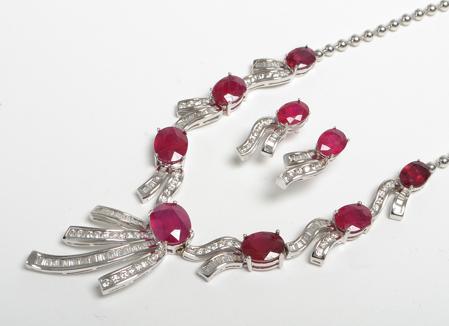 A RUBY AND DIAMOND NECKLACE AND PAIR OF EARRINGS SET IN 18CT WHITE GOLD (RUBIES HAVE BEEN TREATED) - AF