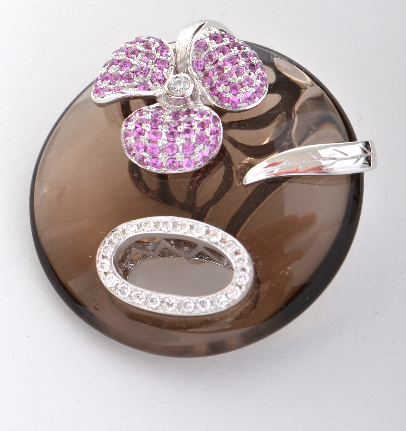 A SMOKEY QUARTZ, DIAMOND AND PINK SAPPHIRE PENDANT SET IN 18CT WHITE GOLD.