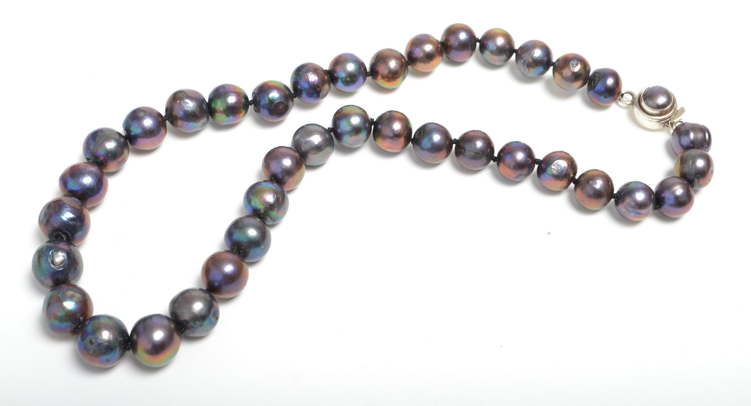 A LARGE STRAND OF FRESHWATER TAHITIAN PEARLS WITH A SILVER CLASP.