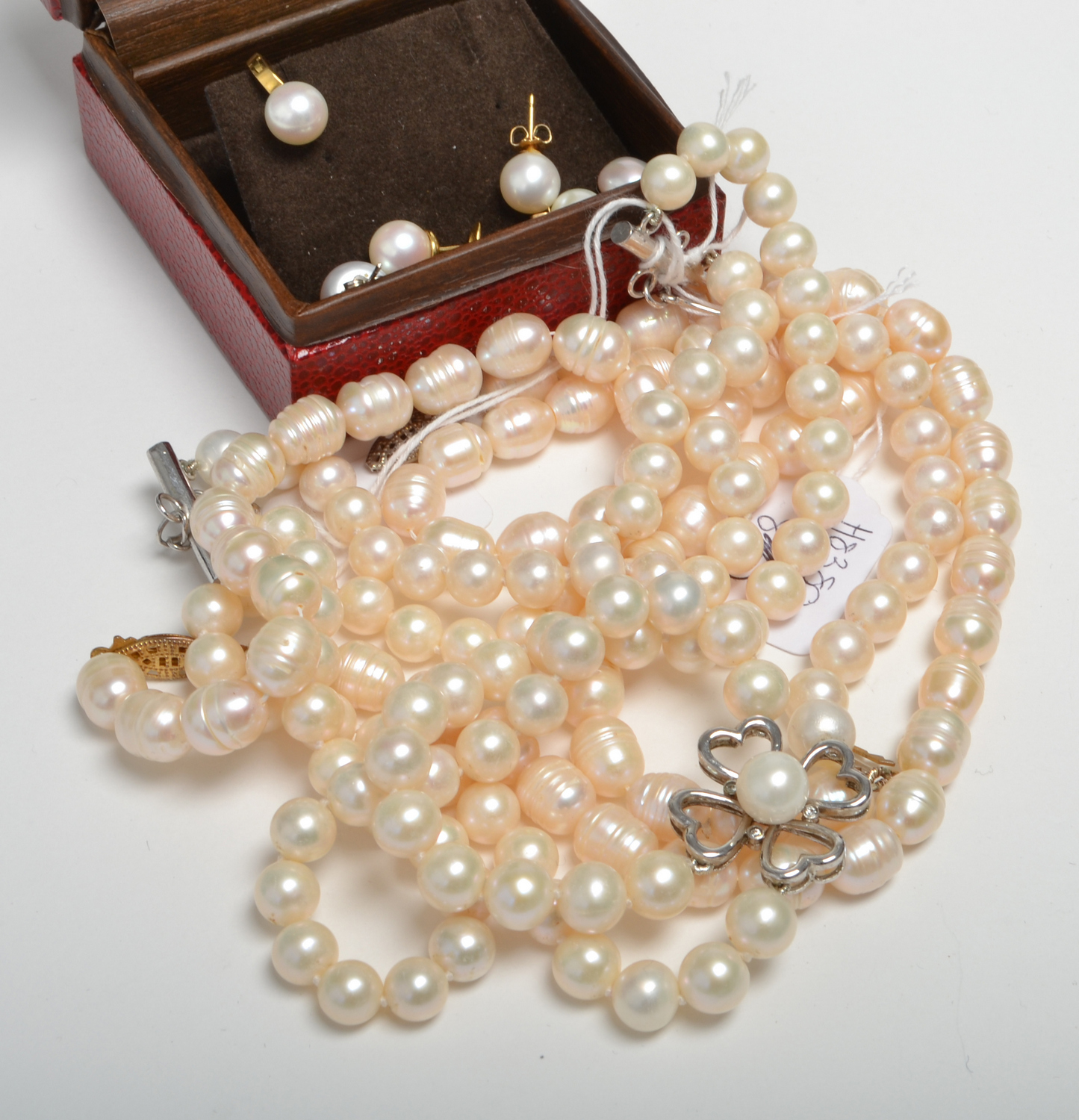 TWO PAIRS OF CULTURED PEARL EARRINGS AND A PAIR OF FRESHWATER PEARL EARRINGS, WITH A DOUBLE STRAND FRESHWATER PEARL NECKLACE WITH SILVER FLOWER PENDANT, TOGETHER WITH FRESHWATER PEARL NECKLACE AND MATCHING BRACELET.