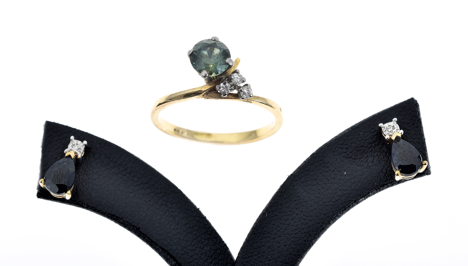 A GREEN SAPPHIRE AND DIAMOND DRESS RING SET IN 18CT GOLD, WITH A SAPPHIRE AND DIAMOND SUITE COMPRISING A PENDANT AND PAIR OF EARRINGS SET IN 9CT GOLD.