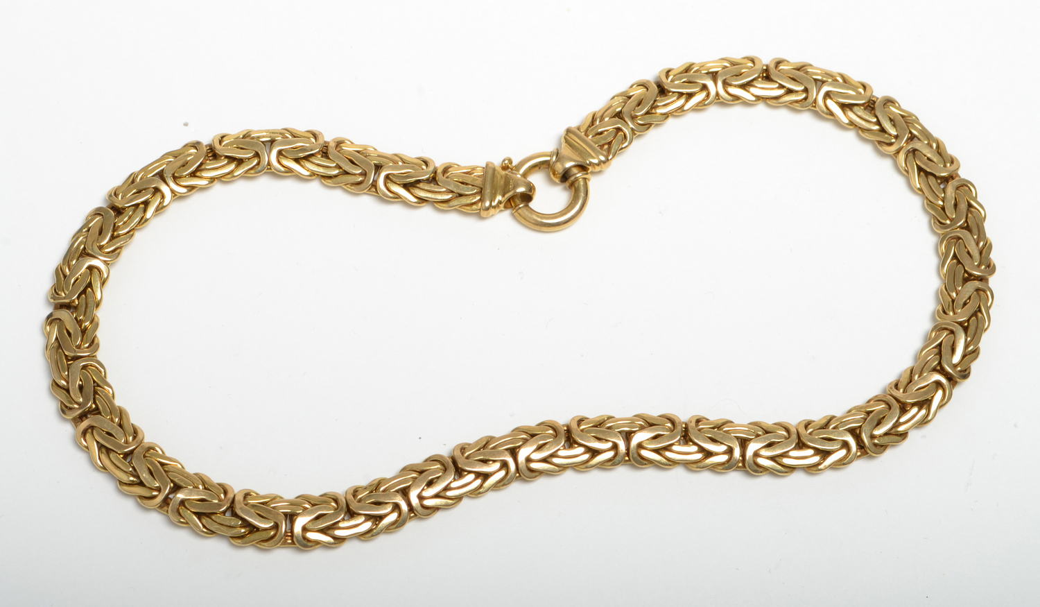 A FANCY LINK WOVEN NECKLACE SET IN 9CT GOLD.
