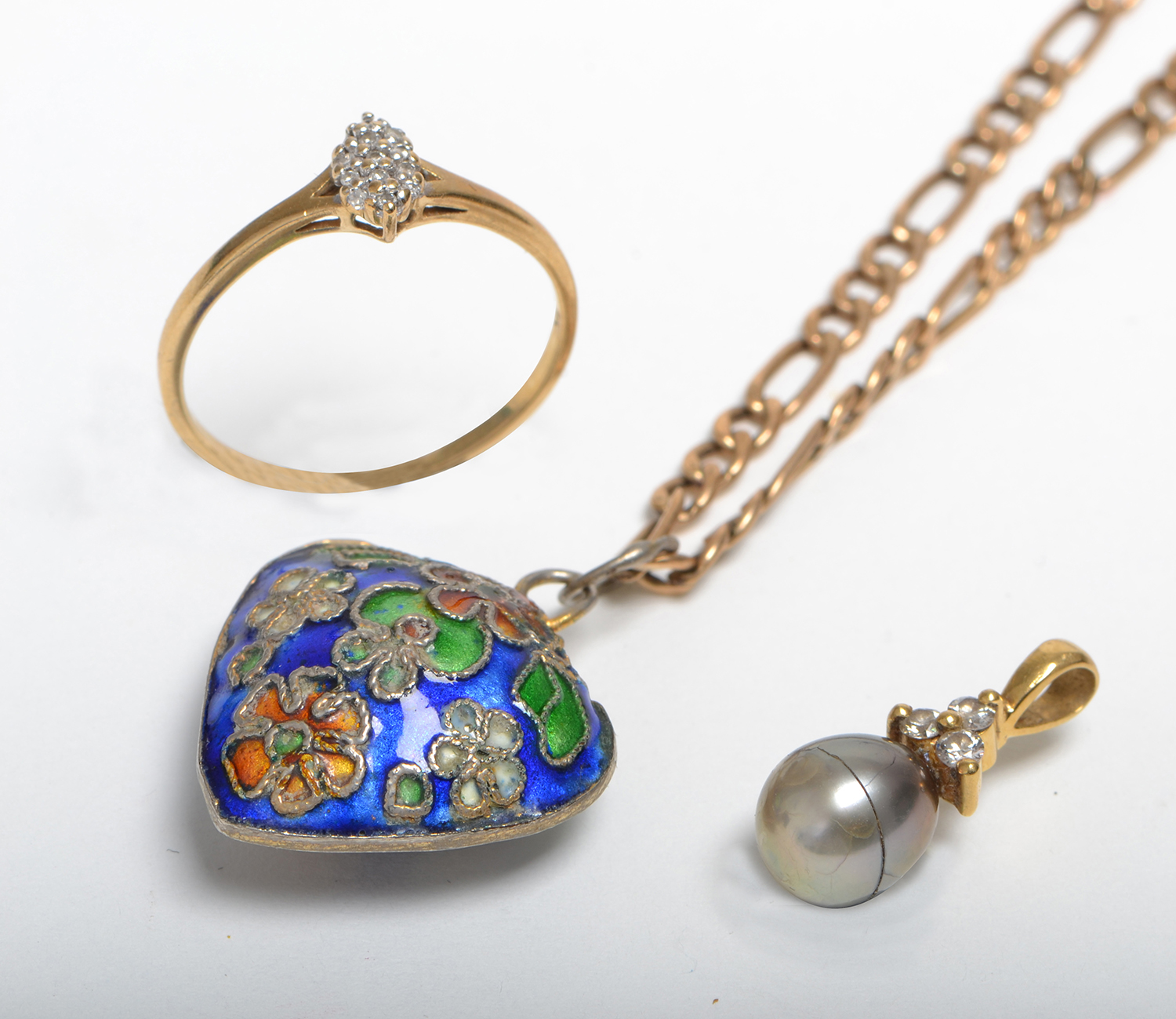 A COLLECTION OF JEWELLERY INCLUDING AN 18CT GOLD AND PEARL PENDANT, 9CT GOLD FIGARO CHAIN, 9CT GOLD AND DIAMOND SET RING AND A CLOISSONE PENDANT.