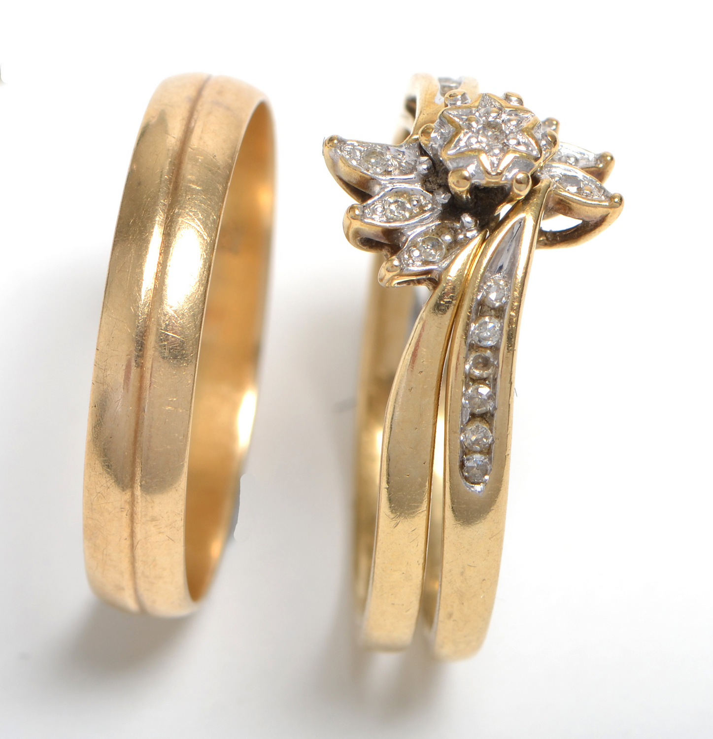 TWO DIAMOND FITTED BANDS SET IN 9CT GOLD AND 9CT GOLD BAND.
