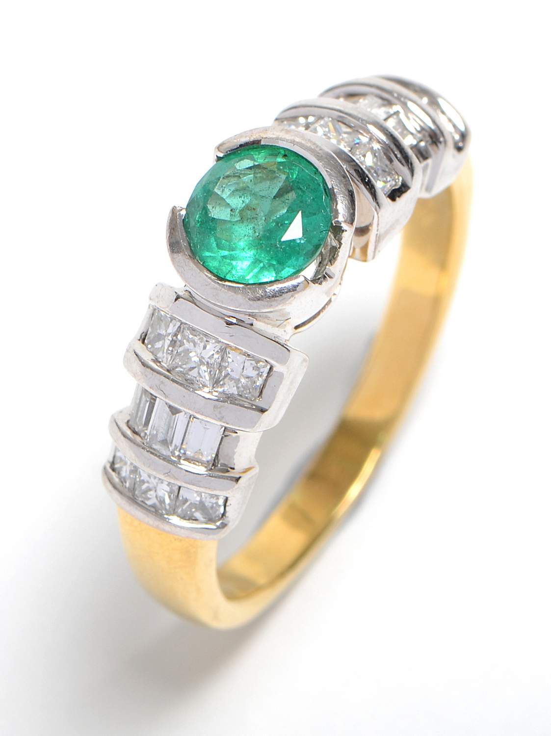 AN EMERALD AN DIAMOND RING IN 18CT GOLD