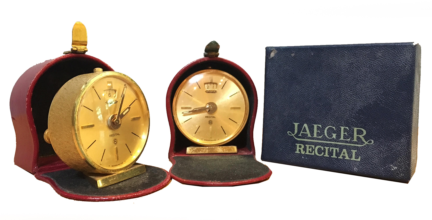 TWO MATCHING JAEGER EIGHT DAY TRAVEL CLOCKS IN FITTED BOXES