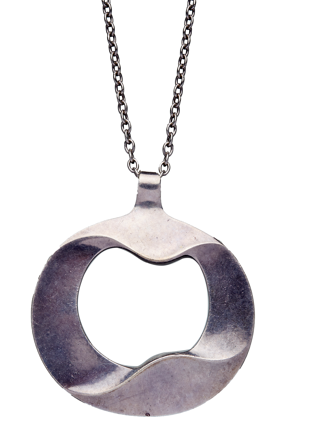 Of abstract design, styled in sterling silver, reference 121, suspended from a silver chain, total length 750mm.