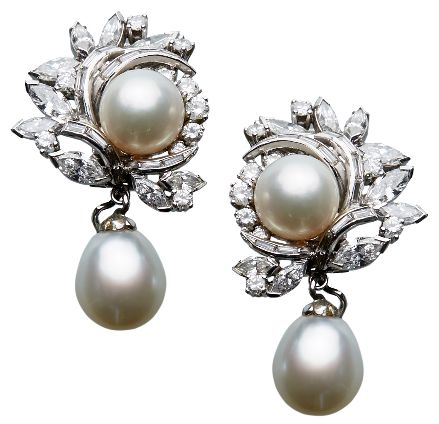 Each set with a detachable pear shaped pearl measuring 9.5mm, suspended from a fancy pearl and diamond retailed by Hardy Brothers Sydney, boxed