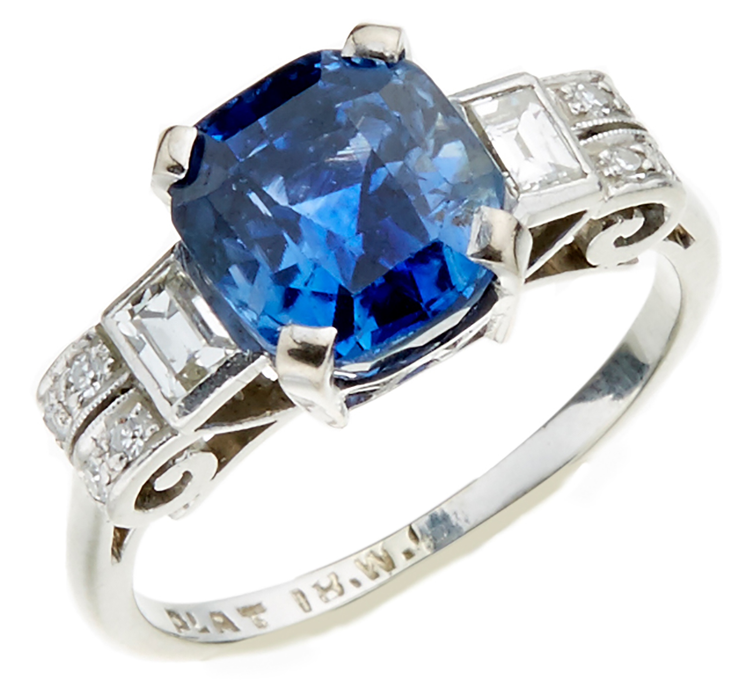 Centrally set with a cushion cut sapphire, flanked by diamonds, mounted in platinum and 18ct white gold, ring size M