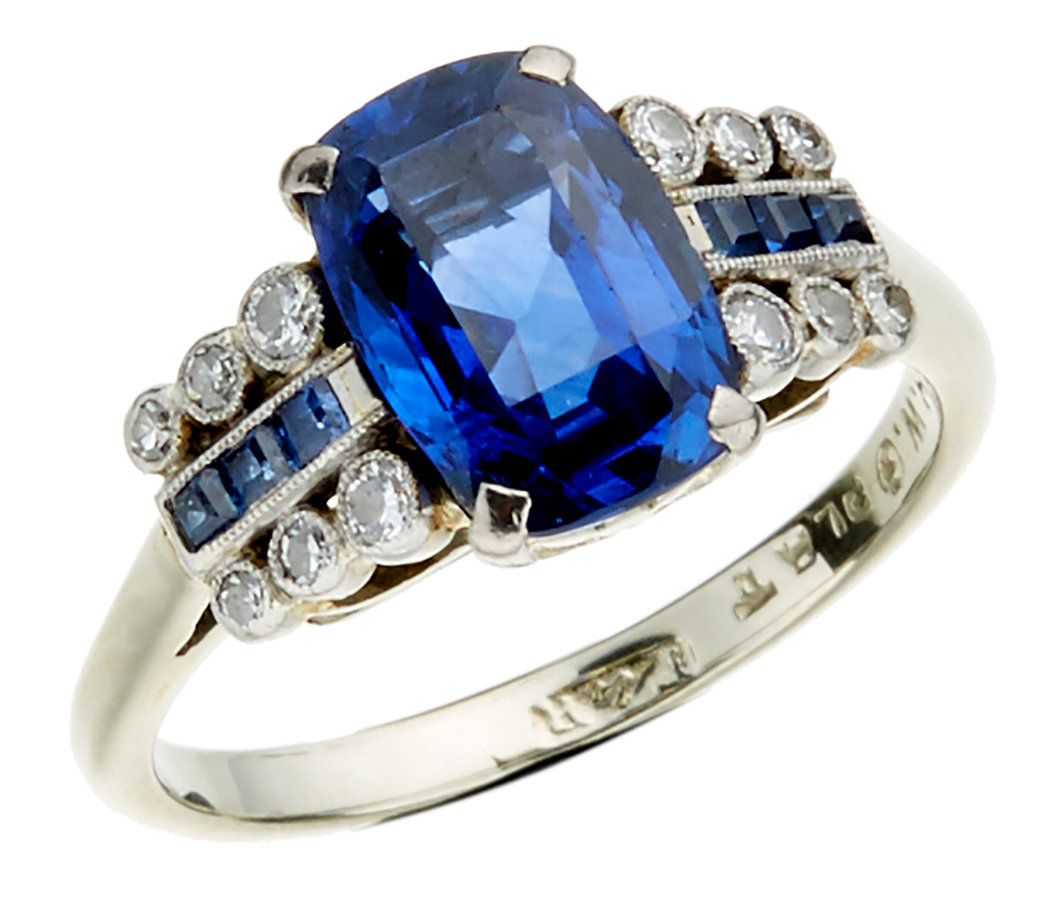 Centrally set with an oval cut sapphire, flanked by diamonds and carre cut sapphires, mounted in platinum and 18ct white gold, ring size L.