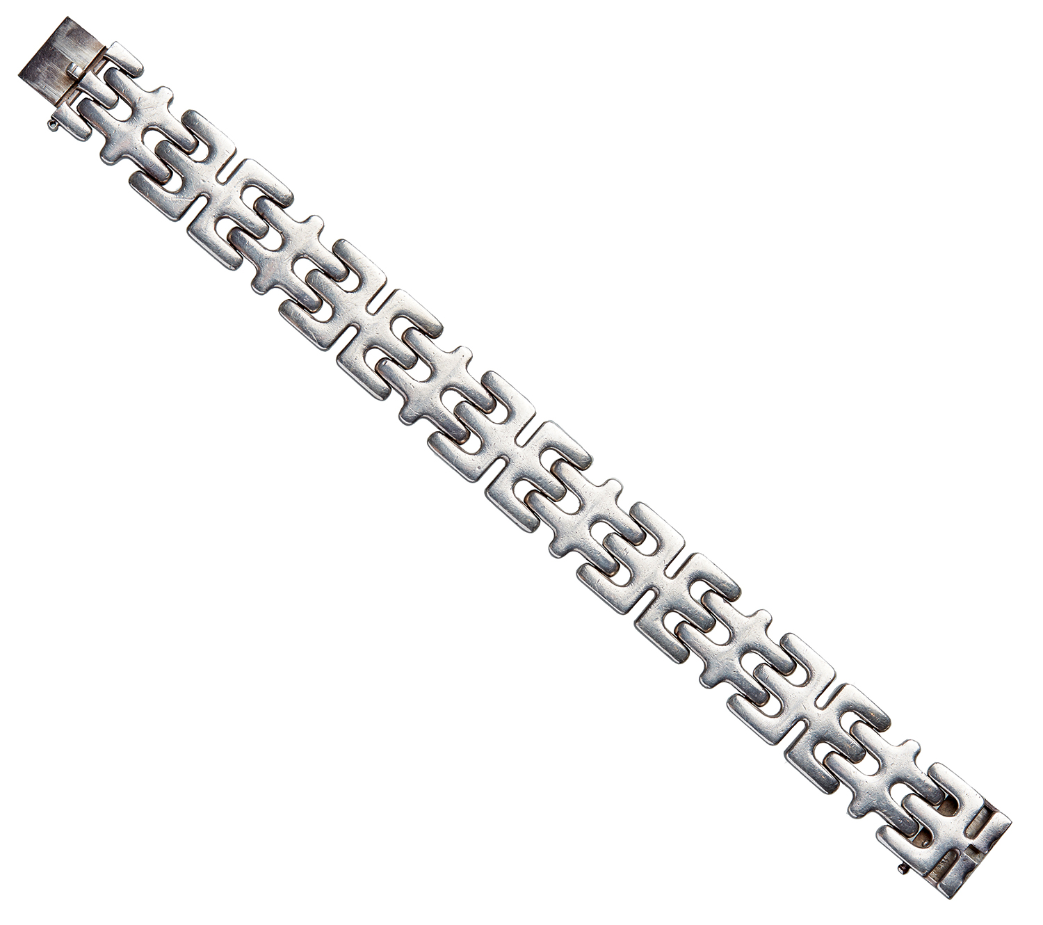 In an abstracted gate-link style, styled in sterling silver, reference ???, total length 182mm.