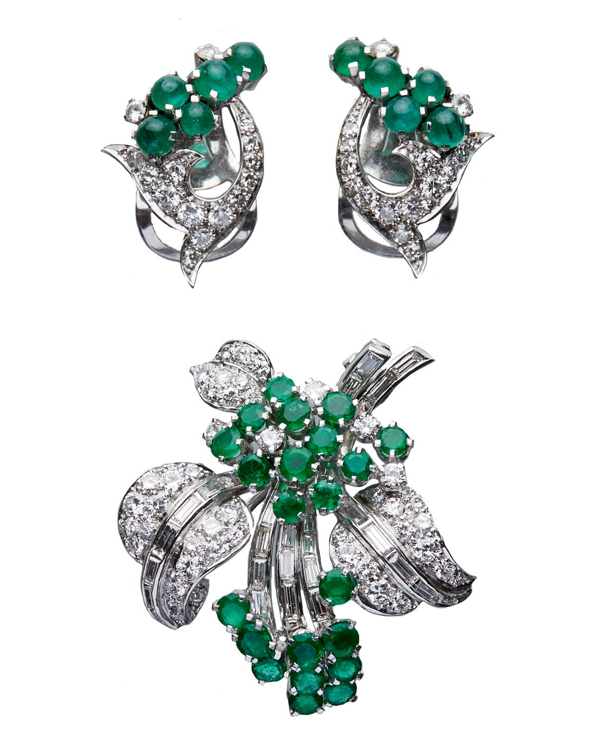 A DIAMOND AND EMERALD COCKTAIL BROOCH AND EARRINGS