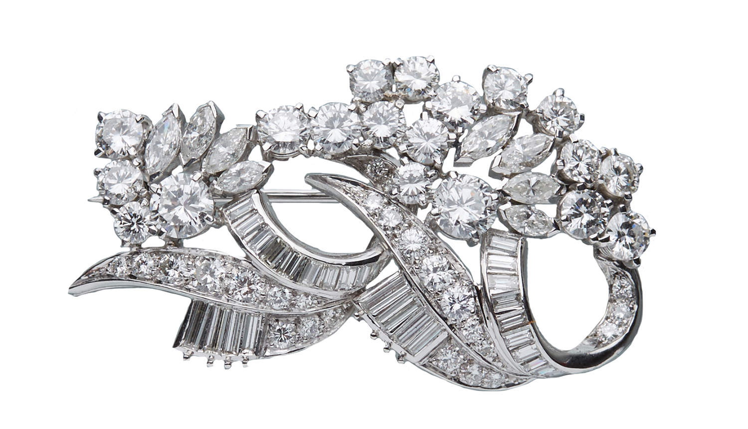 Of floral spray design, set with round brilliant and baguette cut diamonds, mounted in 18ct white gold, retailed by Hardy Brothers, boxed.