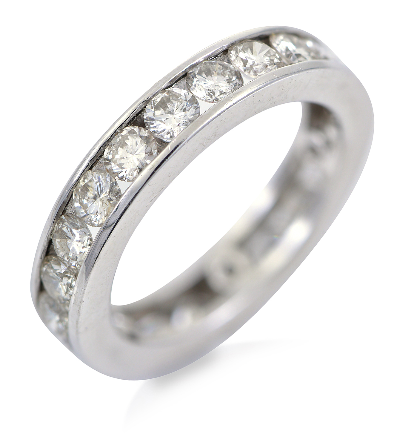 Set with twenty two channel set round brilliant cut diamonds totalling 2.20cts, mounted in 18ct gold, ring size L.