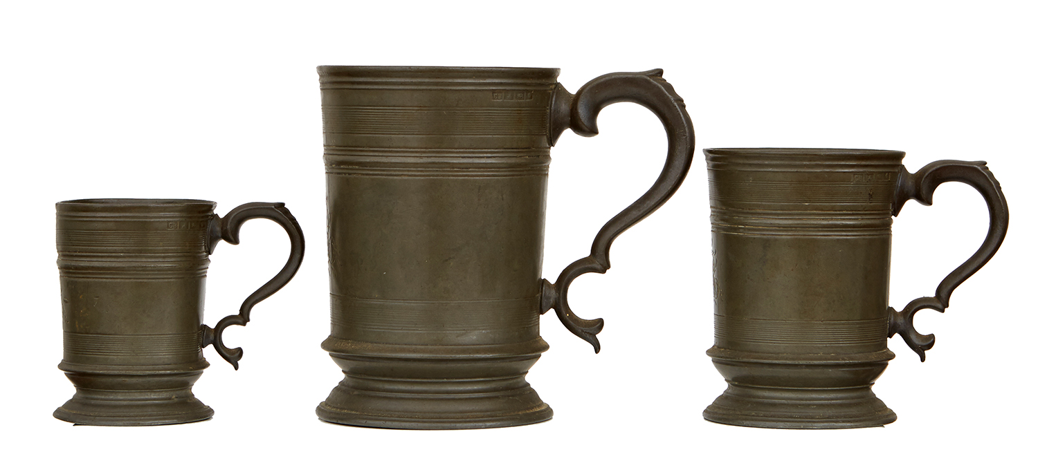 A GRADUTATED SET OF THREE PEWTER STRAIGHT SIDE MUGS