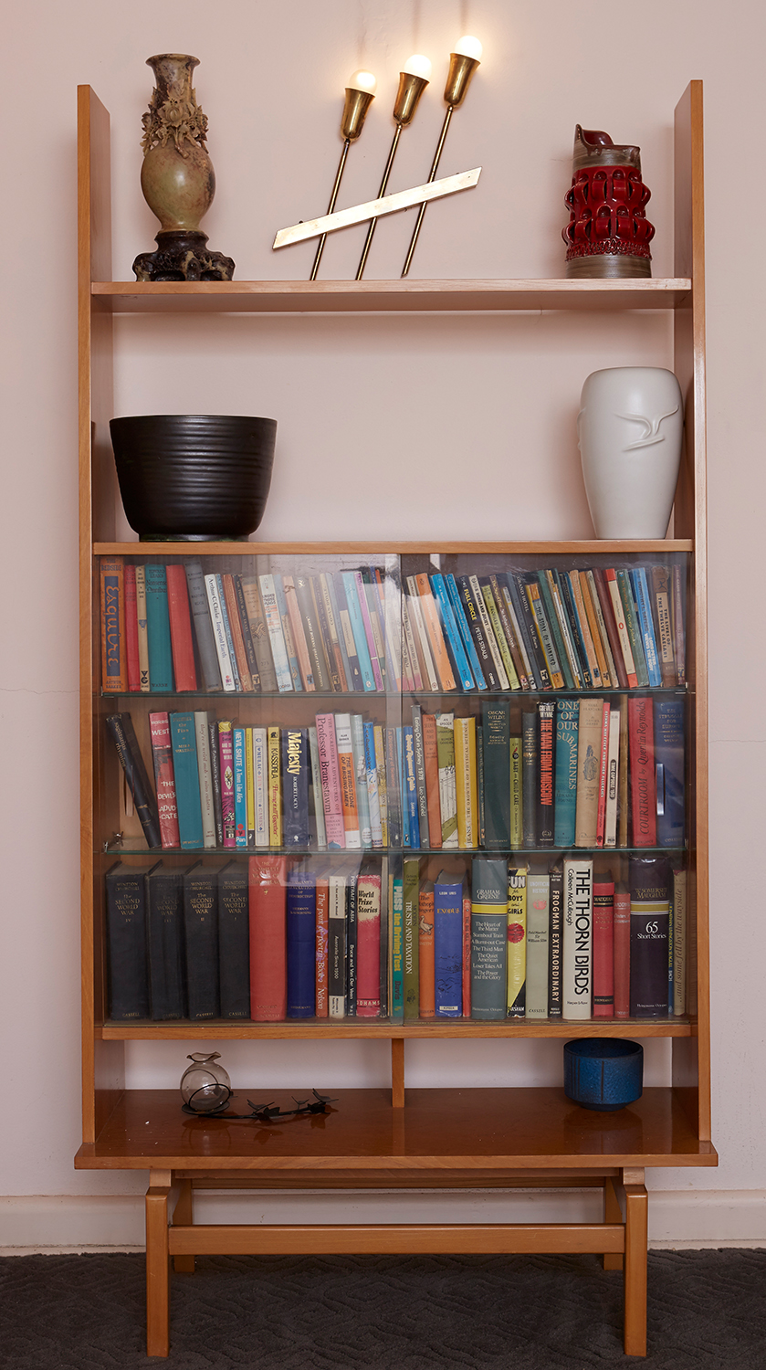 In good condition with minor separation of veneer to back panel within glass case, slight abrasion to the second shelf from use.