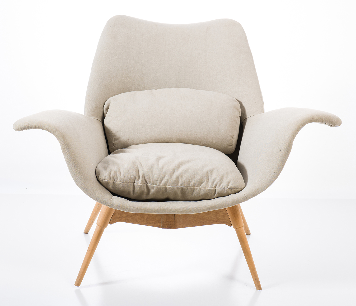 In grey upholstery