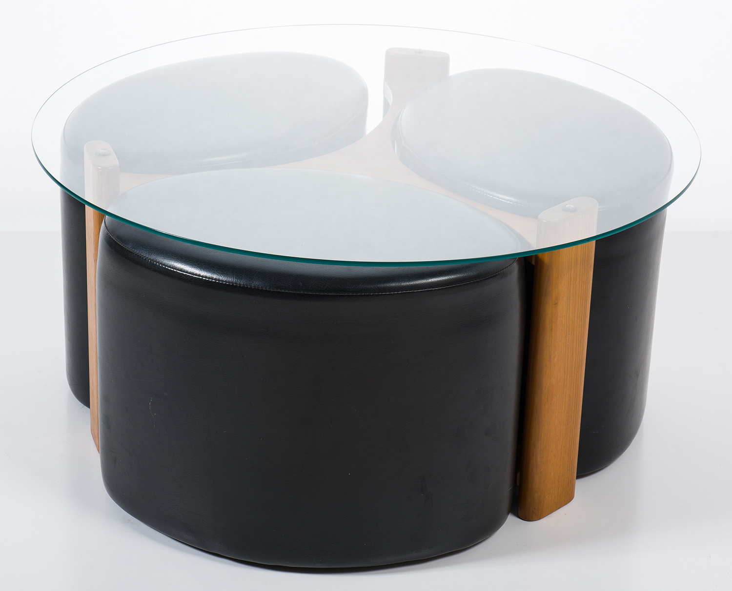 Teak with black vinyl stools and glass top
