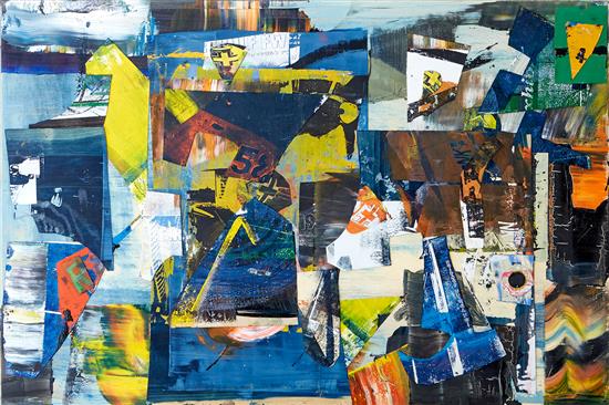 signed, dated and inscribed verso: EVAN SALMON/ TITLE: 'EXCAVATOR' 2002/ OIL ON PLYWOOD AND LINEN